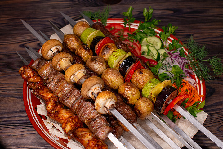 В составе: баранина на кости, картофель по-деревенски, лук репчатый, огурцы, помидоры.